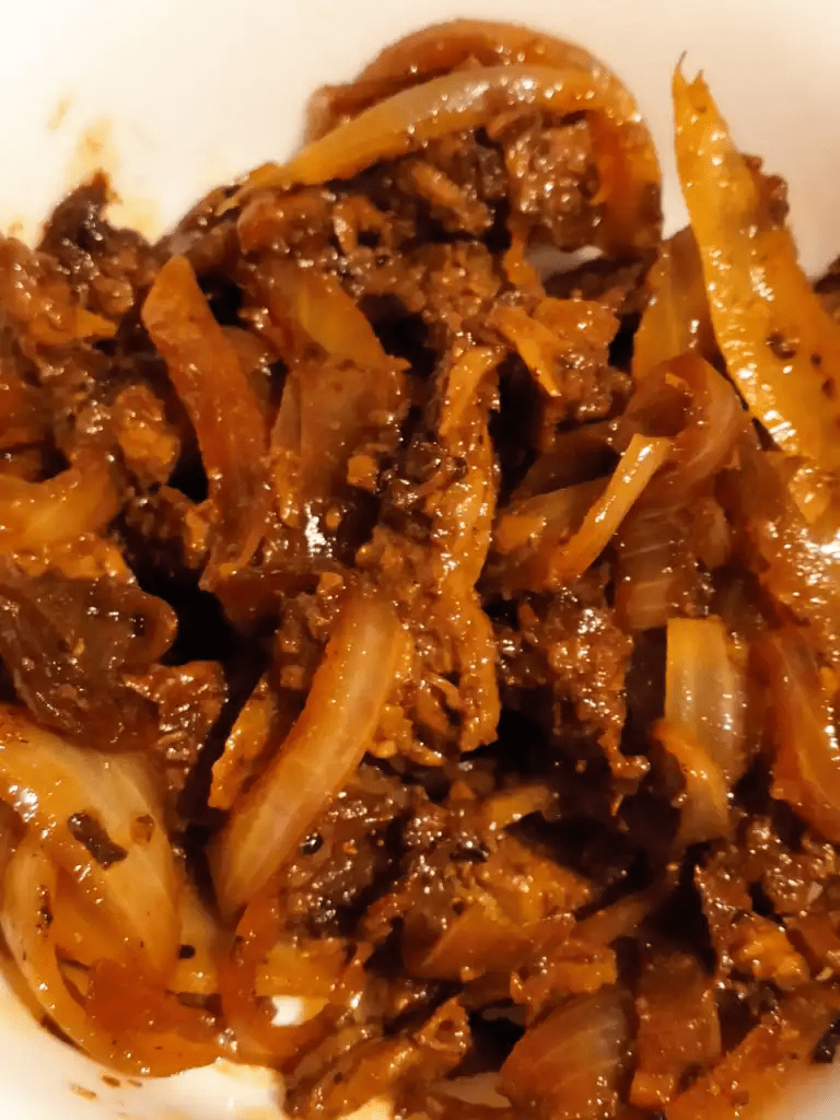 Saute 1 onions in oil until tender – Add 1/2 kg meat and brown – Add Salt – Tomato and spices to taste – Simmer 10 mnts.